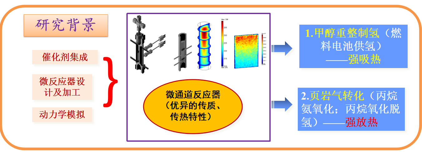 与传统反应器相比,微通道反应器具有比表面积大、传质速率快、料液滞存量少、安全性能高、体积小、易于集成与放大等优点,在化工、医药和生物等领域具有广泛的应用前景。该研究方向从微通道反应器及催化剂的优化集成同时入手,结合本征动力学和微通道反应器内传递现象及界面反应的深入研究,利用微通道反应器传热传质快等特点,将微通道反应器应用于丙烷氨氧化制丙烯腈等强放热反应以及甲醇重整制氢等强吸热反应中。
